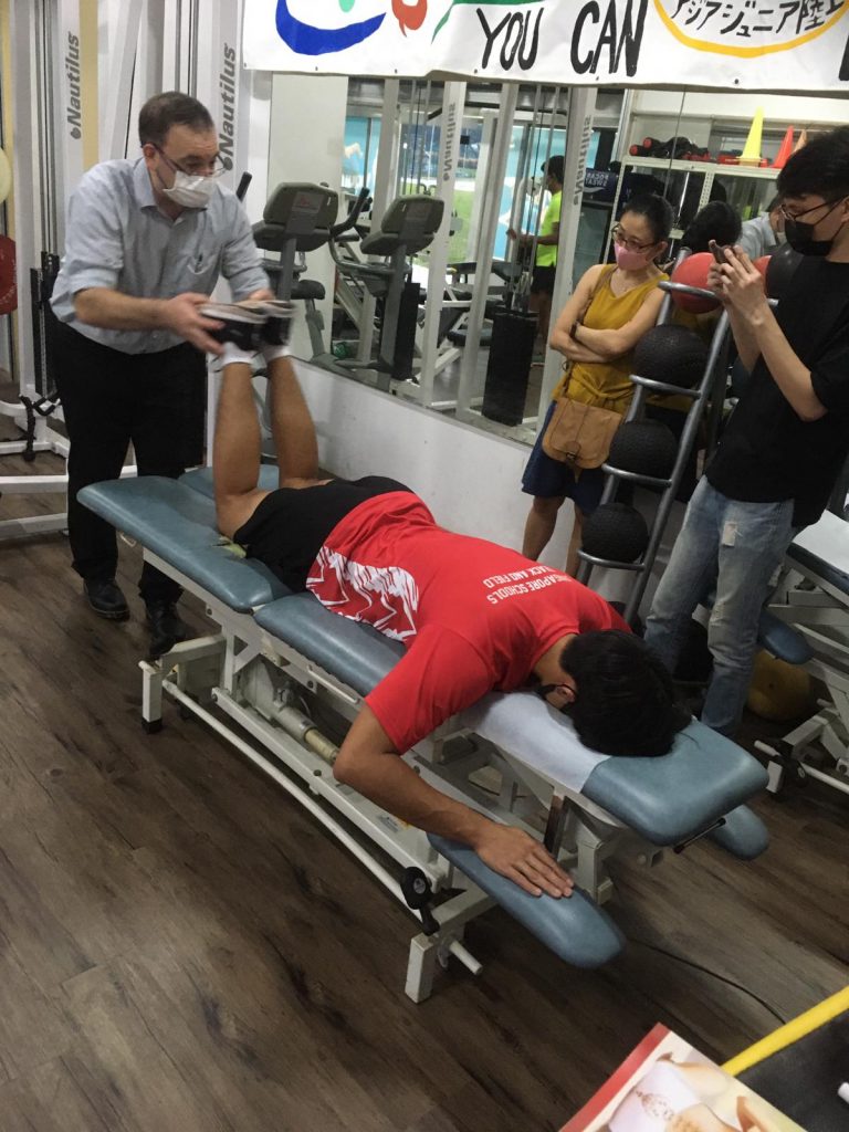 Dr. Bryan Hymas from Chiropractic First performing diagnostic structural analysis and screening for our U18 Javelin Thrower, Roy Ng and our other high-performance athletes.